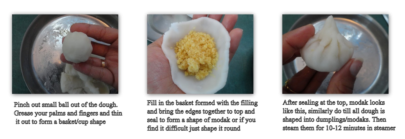 - Put in a tsp. or two of filling and gently pull over the edges to the top to form a modak and seal well on top.